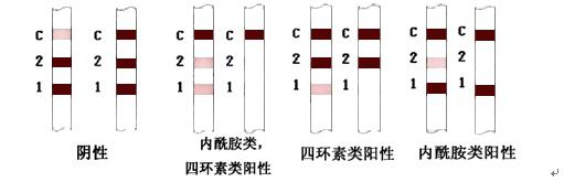 1、 陰性(-):1線顯色比C線(對(duì)照線)深或一樣深,表明樣品中四環(huán)素類濃度低于檢測(cè)限或無四環(huán)素類殘留,2線顯色比C線(對(duì)照線)深或一樣深,表明樣品中內(nèi)酰胺類濃度低于檢測(cè)限或無內(nèi)酰胺類殘留